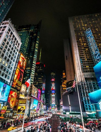 Experience the vibrant heart of NYC with its bright lights and bustling atmosphere
